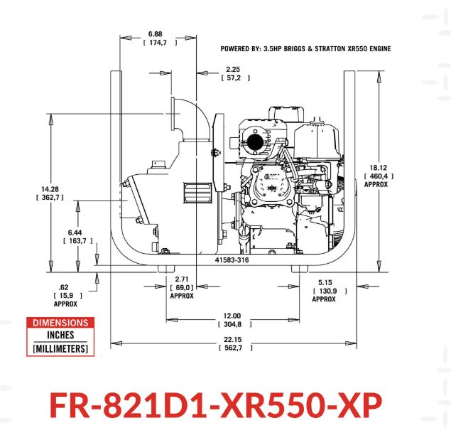 The FR-82D1-XR550-XP is a self-priming centrifugal pump producing up to 130 GPM for bulk fuel transfer. It’s equipped with a reliable Briggs & Straton® 3.5HP, 7.75 cubic inch single cylinder, 4-stroke, air-cooled overhead valve engine, delivering dependability you can count on day-in and day-out.