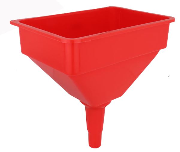 This is a heavy-duty Polyethylene funnel with an opening of 10” x 7” and an outlet of 1 1/8”. Includes a brass screen mesh to capture debris.